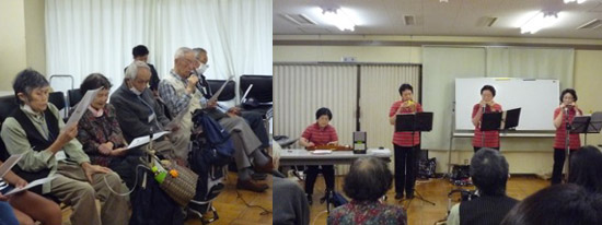 残念ながら、当日は雨脚が強くなってしまったため、参加ご予定の方でも来られなくなった方もいらっしゃいましたが、ご参加いただいた方達は、第一部は"種"が解りそうで解らない「たなちゃん」こと田中道夫さんの素晴らしいマジックと絶妙のトークに真剣に見入っていました。また、第2部では「サークルしゃぼん玉」の方々のハーモニカ・オカリナ・大正琴による見事な演奏とハーモニカによる伴奏で、懐かしい唱歌や昭和の名曲をみんなで一緒に唄ったりして大変に楽しい時間を過ごすことができました。