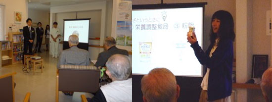 今回の平岡先生のご講演では、その容貌通りのソフトな語り口で無理せずにちょっとしたことで楽に食べたり、栄養価を増やす工夫をわかりやすくお伝えいただきました。ご参加いただいた方には、栄養補給剤の見本や味を変えずにカロリーを増すための「粉飴」をサンプルとしてお持ち帰りいただきました。