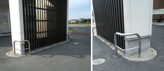 当クリニックは開院して3年6ヶ月になりましたが、その間にこの玄関ポーチの角に接触する事故が数件生じております。幸いに大きな破損や怪我には至っていないのですが、設計士さんなどとも相談した結果「大きな損傷」になる前に防止策を考えた方が賢明であるとのアドバイスを頂戴し、設置に至ったものです。