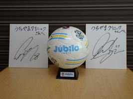 両名のサイン入りボールをプレゼントしていただき、待合室に張り出したフラッグと色紙にサインを頂きました。