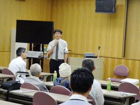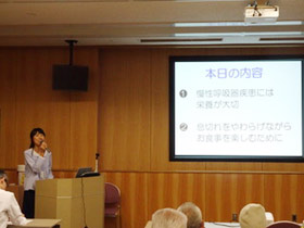 6月10日日曜日に磐田市立総合病院の2階講堂にて、帝人在宅医療の平岡管理栄養士から「いかに呼吸を苦しくしないように栄養を摂取するか」というお話しをいただき、また磐田市立総合病院の理学療法士の先生から、「自宅でもできる呼吸リハビリ」を教えていただきました。さらに、酸素を吸っていても旅行はできる!と言う案内も業者の方からいただきました。