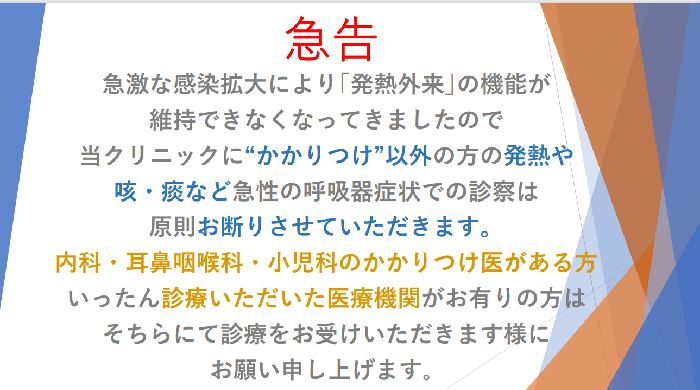 急激な感染拡大により「発熱外来」の機能が維持できなくなってきましたので