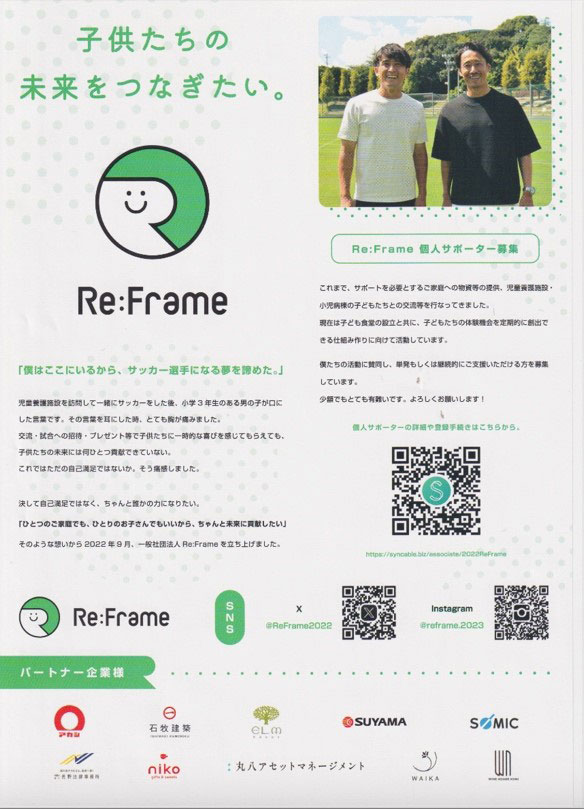 「Re:Frame」は、J1ジュビロ磐田の山田大記選手と小川大貴選手(現在 JEF千葉に期限付き移籍中)が「子供たちの未来をつなぎたい。」をコンセプトとして2022年9月に立ち上げた組織です。