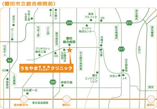 - JR「磐田駅」から遠鉄バス「磐田市立病院行き」で約25分、磐田市立病院バス停下車徒歩2分